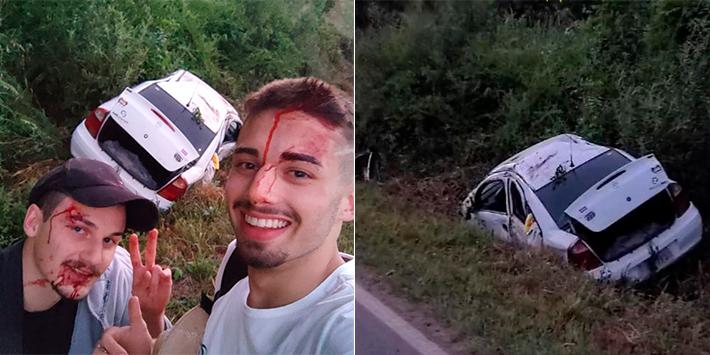 RIO GRANDE DO SUL – Os amigos Nickolas Tonet, de 19 anos, e Lucas Gelain, de 20 anos, escaparam da morte e resolveram rir para ela. Os dois capotaram no carro, enquanto voltavam de uma festa, se feriram e ficaram ensanguentados com ferimentos pelo corpo.