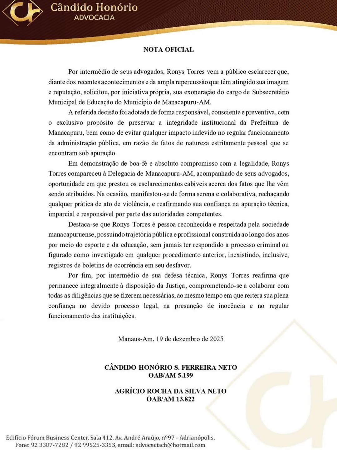 MANACAPURU (AM) – Ronys Torres, ex-lutador do UFC conhecido como “Jungle Boy”, renunciou ao cargo de subsecretário municipal de Educação de Manacapuru, na região metropolitana de Manaus. A exoneração foi anunciada pelo próprio Torres em suas redes sociais na noite de sexta-feira (19), após sua companheira denunciá-lo publicamente por violência.