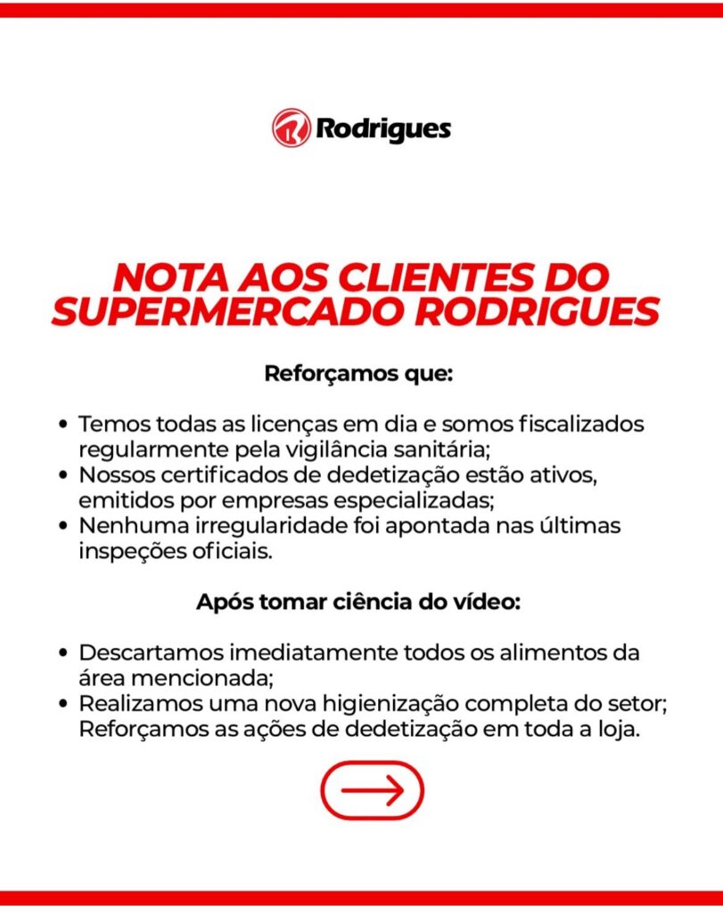 Em nota oficial, a rede de supermercados afirmou que está tratando o caso com “máxima seriedade e transparência” e garantiu cumprir todos os requisitos sanitários, incluindo licenças em dia e contratos ativos de dedetização. A empresa também destacou que passou recentemente por uma fiscalização e que descartou imediatamente todos os alimentos da área que aparecem no vídeo.