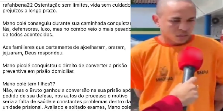 MANAUS (AM) – Um perfil atribuído a um suposto policial da Rondas Ostensivas Cândido Mariano (Rocam), identificado como Rafael Benarrós, divulgou nesta sexta-feira (1º) que João Lucas da Silva Alves, 24, conhecido como “Lucas Picolé”, conseguiu prisão domiciliar por motivo de saúde. Segundo a publicação, ele teria HIV e estava doente.