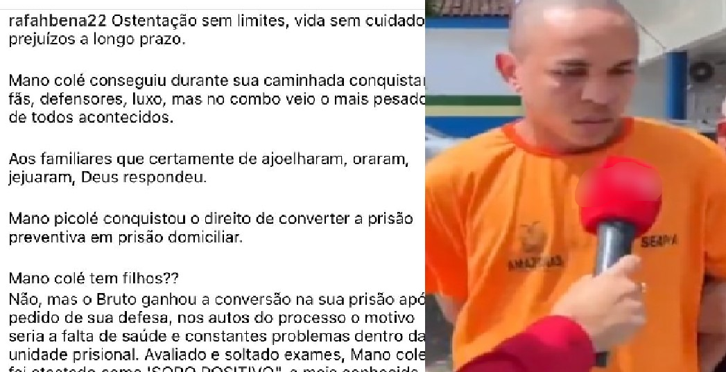 MANAUS (AM) – Um perfil atribuído a um suposto policial da Rondas Ostensivas Cândido Mariano (Rocam), identificado como Rafael Benarrós, divulgou nesta sexta-feira (1º) que João Lucas da Silva Alves, 24, conhecido como “Lucas Picolé”, conseguiu prisão domiciliar por motivo de saúde. Segundo a publicação, ele teria HIV e estava doente.