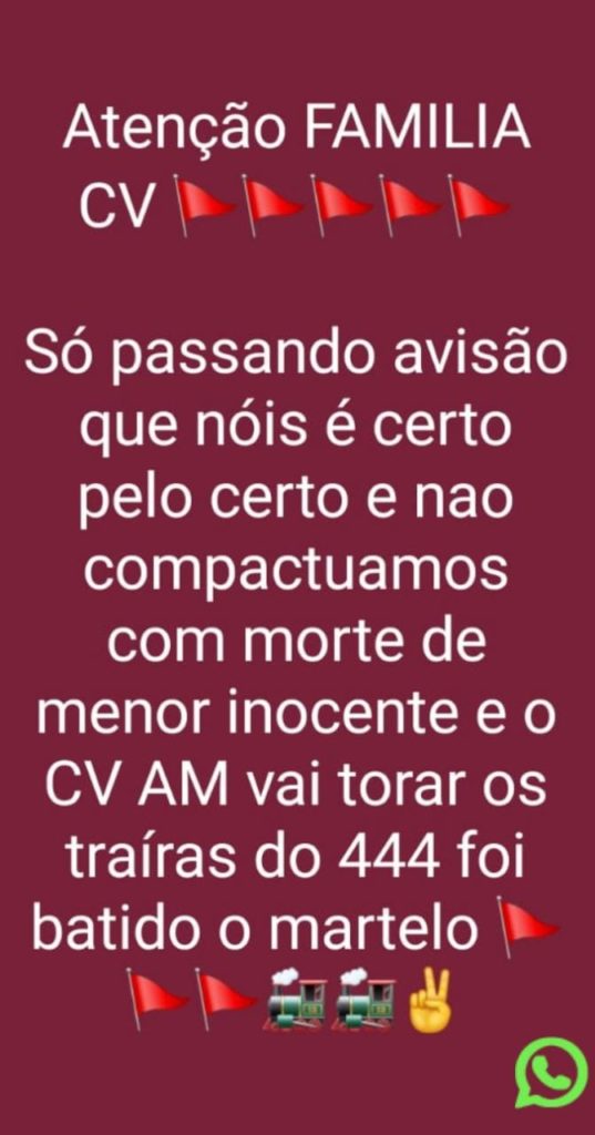 Os membros do CV, que seriam do “Tribunal do Crime”, escreveram na mensagem que o assassinato foi cometido na área deles e que a situação não ficaria assim. “CV não mata inocente”, diz mensagem.