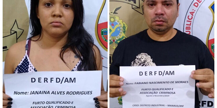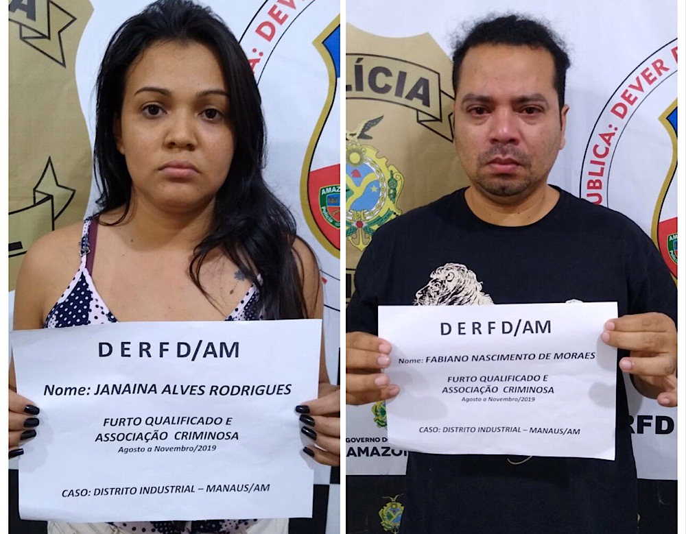 Fabiano Nascimento de Moraes, 36, e Janaína Alves Rodrigues, 26, foram presos suspeitos de desviarem mais de R$ 100 mil em matéria-prima de uma empresa multinacional do Polo Industrial de Manaus.