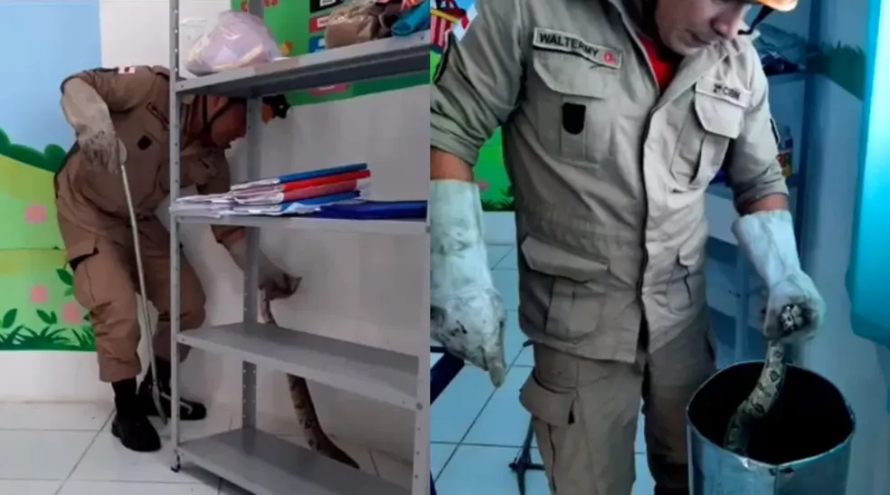 De acordo com a a 2ª Companhia Independente Bombeiro Militar (CIBM), o animal oferecia riscos e a equipe foi acionada para fazer a remoção em segurança. A jiboia estava atrás de um armário da creche.