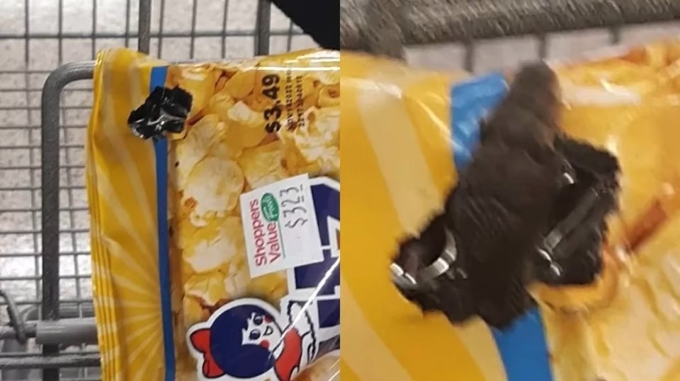 Kimberly disse que havia armadilhas para ratos na prateleira de baixo. Ela então foi pegar outro saco de pipoca, mas notou que a embalagem tinha um pequeno buraco no canto superior direito.