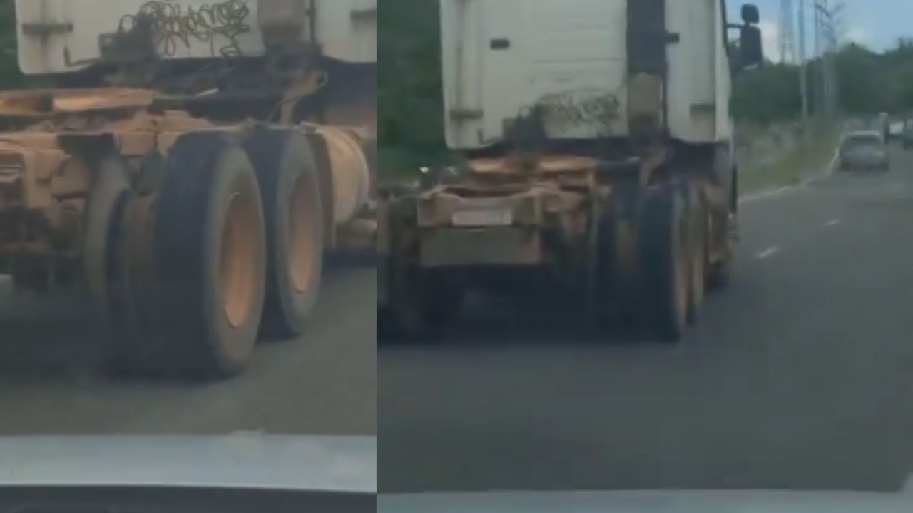 As imagens foram registradas por uma motorista que passava pelo local. No vídeo, o caminhão aparece com o pneu destruído, soltando fumaça enquanto roda. “Olha a doideira desse cara, meu Deus”, diz a motorista. Ela comenta que o pneu estava raspando no chão e soltando fumaça.