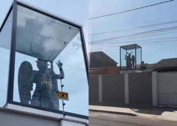 Moradora coloca estátua de Belzebu de 2 metros em muro de casa no Alvorada