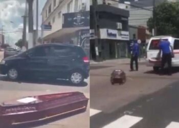Funerária deixa caixão cair no meio da rua e trânsito fica congestionado