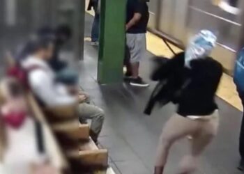 NOVA YORK | O vídeo chocante captura o momento exato em que uma mulher usando uma bandana nos cabelos, empurrou ...