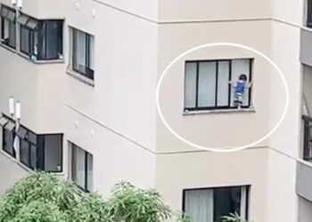 Criança é flagrada pendurada do lado de fora de janela de edifício; veja vídeo