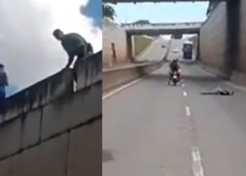 Vídeo: estelionatário pula de viaduto para fugir da PM, sobrevive na UBS e vai em cana