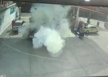 Carro explode em posto de gasolina e deixa duas pessoas feridas; veja o vídeo