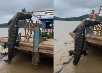 AMAZONAS - Garimpeiros que andam pelos rios da Amazônia capturaram, filmaram e compartilharam a aventura de fisgar um jacaré gigante ...