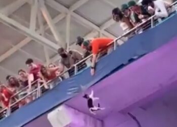 Gatinho despenca de arquibancada e mobiliza torcedores em resgate; veja vídeo