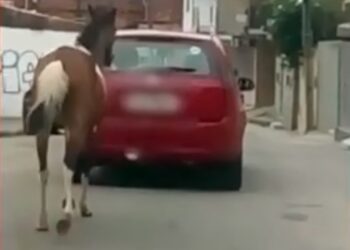 BAHIA | O motorista de um carro foi flagrado puxando um cavalo por uma corda, no município de Poções (BA). ...