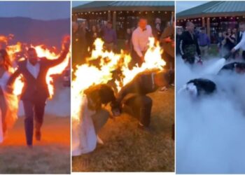 Noivos ‘pegam fogo’ durante casamento e assustam convidados; veja o vídeo