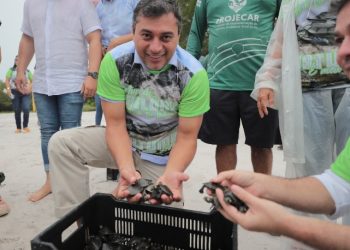 Amazonas - O governador Wilson Lima participou da soltura de 20 mil filhotes de tartarugas, tracajás e iaçás, na comunidade ...
