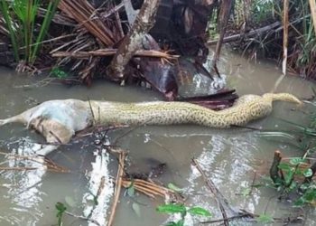 Vídeo: Sucuri morre engasgada no igarapé tentando comer um cachorro: ‘morreu de atrevida’