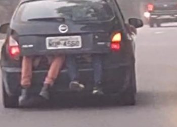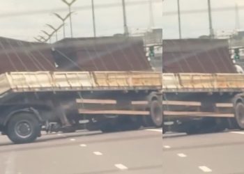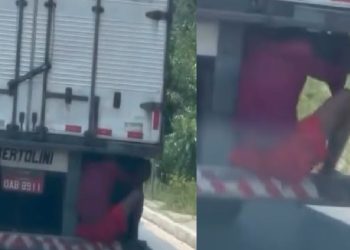 MANAUS - Um homem corajoso e irresponsável foi flagrado escondido na traseira de um caminhão em Manaus, escondido, pegando uma ...