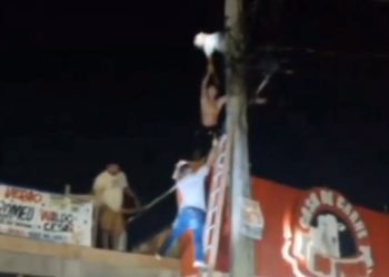 MANAUS, AM - Um morador do Viver Melhor subiu em um poste na noite de ontem (22) para mexer na ...