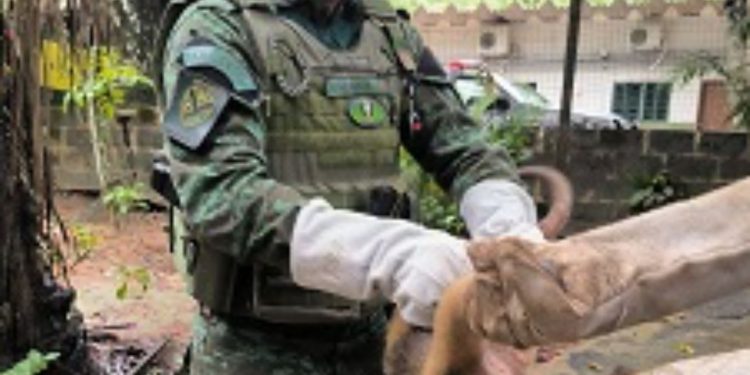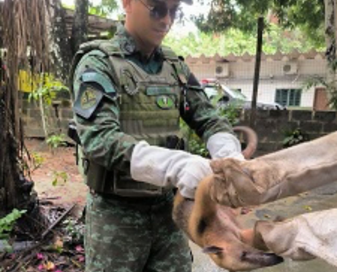 Segundo os policiais militares, a ocorrência foi repassada, via linha-direta do Batalhão Ambiental, por volta de 8h. De imediato, os PMs se deslocaram até o endereço indicado e encontraram o animal.