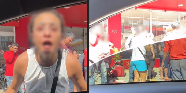 A situação era tensa por conta do calor e do perigo da criança ficar sem oxigênio. Na imagem é possível ver que a mulher fica muito nervosa enquanto vê os frentistas e motoboys tentando abrir alguns dos vidros das janelas.