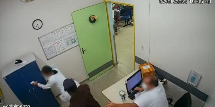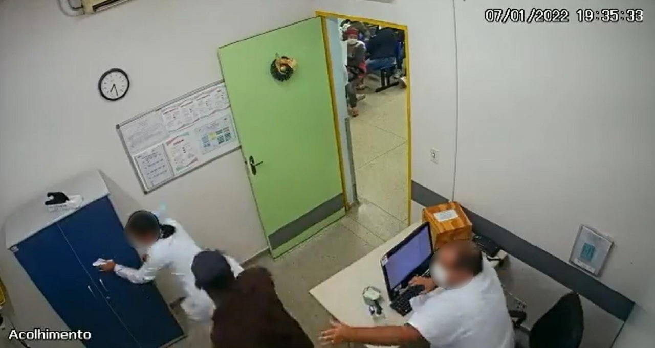 Imagens de câmeras de segurança mostram o momento em que um homem entra irritado no consultório de um médico na unidade e começa a mexer em prontuários até que a outra profissional de saúde se aproxima para ajudar o colega.