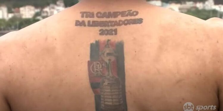 RIO DE JANEIRO | Empolgado pela possibilidade de uma nova taça, um torcedor do Flamengo tatuou em suas costas a seguinte frase: “Tri campeão da Libertadores 2021”, acompanhada de uma imagem da taça do torneio. A arte foi feita antes da final contra o Palmeiras, vencida pelo time alviverde.