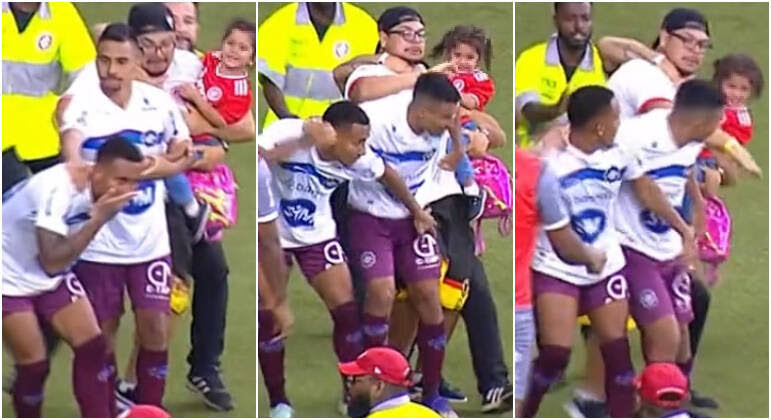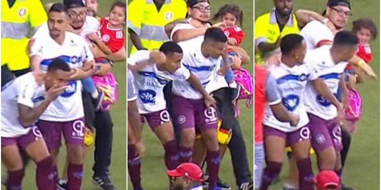 PORTO ALEGRE (RS) – Um torcedor do Internacional invadiu o campo com uma criança no colo e agrediu um jogador do Caxias.