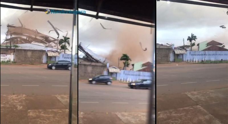 Vídeos gravados por populares mostraram os ventos destruindo telhados de casas e empresas, além de arrancar uma estrutura metálica e derrubar uma bomba de combustível.