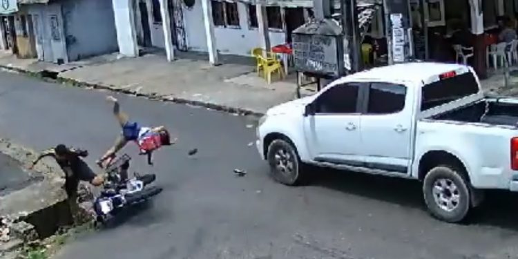MANAUS – Pai, mãe e filho de 5 anos foram arremessados de uma moto ao serem atingidos por uma Hilux no Alvorada, zona oeste de Manaus. As imagens viralizaram nesta quinta-feira (28).