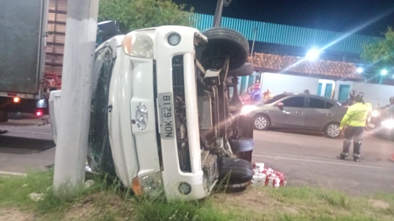 MANAUS (AM) – Um veículo de distribuição capotou na noite desta segunda-feira (13) na Avenida Cosme Ferreira, em frente à Feira do Coroado, zona leste de Manaus, deixando três pessoas envolvidas.