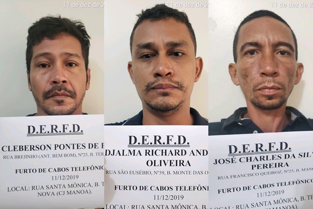 Os homens foram identificados como Cleberson Pontes de Brito, de 36 anos; Djalma Richard Andrade Oliveira, 35 anos e José Charles da Silva Pereira, de 38. As prisões foram feitas após uma denúncia anônima que relatou que os suspeitos estariam cometendo furtos de fios e afetando o fornecimento de energia elétrica e internet do local.
