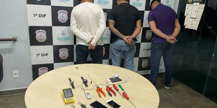 Manaus (AM) – Três pessoas foram presos nesta sexta-feira (23) em Manaus, acusados de cometerem furtos utilizando um dispositivo conhecido como ‘Chapolin’. São eles: Lázaro Almeida, de 21 anos, Leonidas Pereira, de 27 anos, e Natan Pinto, de 24 anos.