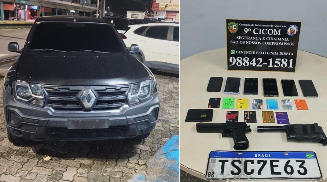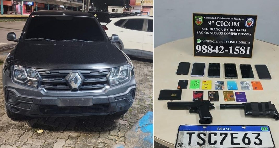 Os três estavam em um carro de cor preta, sem placa dianteira, saindo de um beco perto do Zezão. Neste momento, ele acabaram pegos com seis celulares cartões de crédito e débito e dois simulacros de arma de fogo.