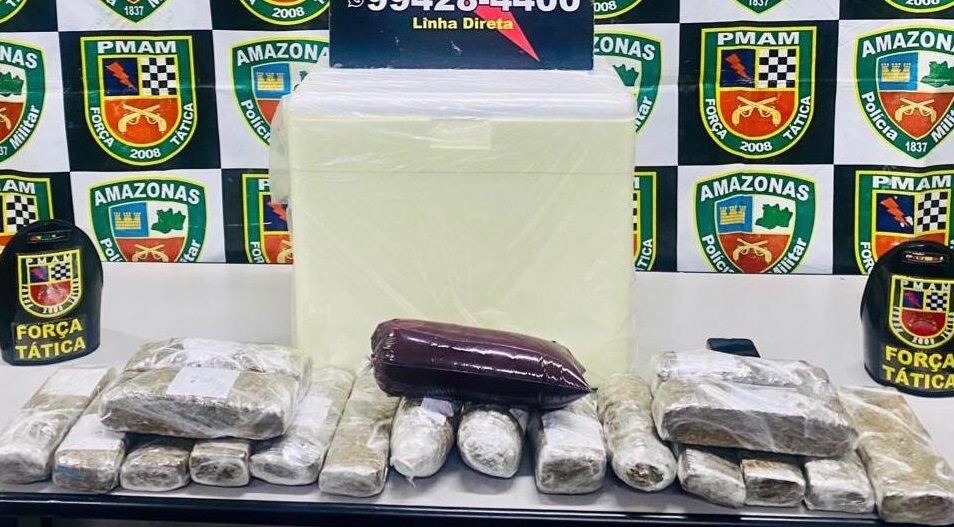 MANAUS – AM| Policiais militares da Força Tática detiveram em flagrante, na manhã desta quarta-feira (17/03), na avenida Nepal, bairro Nova Cidade, zona norte de Manaus, um homem, de 36 anos, por tráfico de entorpecentes, os quais eram embalados em sacos de açaí e despachados para várias cidades do país. Na ação, foram apreendidos aproximadamente 10kg de drogas, divididos em 19 tabletes de substância com aspecto de maconha tipo Skunk.