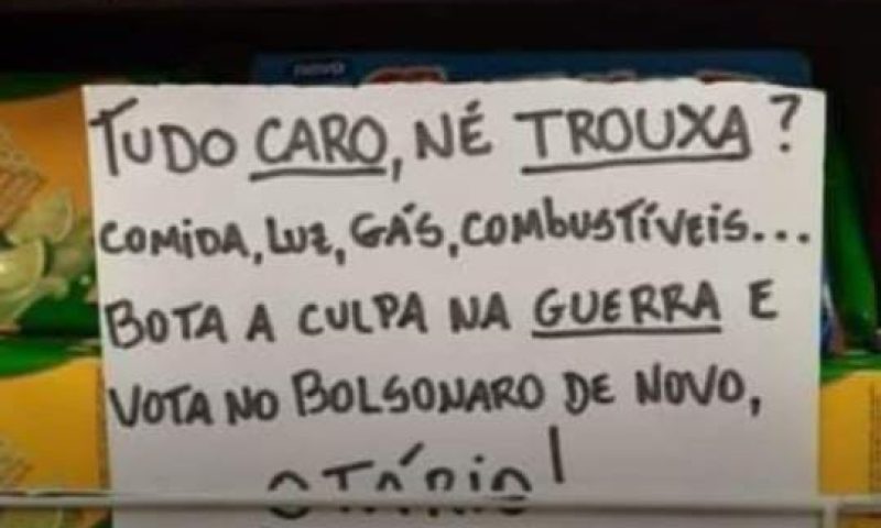 BRASIL – Uma imagem criticando o aumento dos alimentos viralizou na internet nos últimos dias, principalmente no Twitter. “Tudo caro, né trouxa?”, provocava o bilhete, que seria direcionado para bolsonaristas. “Bota a culpa na guerra e voto no Bolsonaro de novo”, ironizava.
