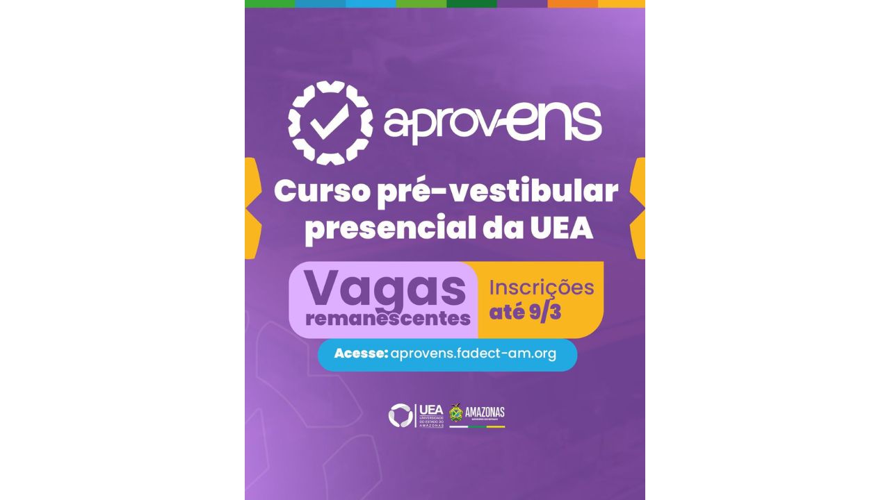 MANAUS (AM) – Estão abertas, desde quinta-feira (26/2) até 9 de março de 2026, as inscrições e matrículas para as vagas remanescentes do AprovENs 2026, curso pré-vestibular presencial oficial da Universidade do Estado do Amazonas (UEA). Em seu terceiro ano de realização, o programa consolida-se como uma das principais alternativas de preparação para estudantes, trabalhadores e demais candidatos que desejam ingressar na instituição por meio do Vestibular tradicional ou do Sistema de Ingresso Seriado (SIS). Ao todo, são ofertadas 113 vagas remanescentes, distribuídas entre os níveis SIS 1, SIS 2, SIS 3 Plus – novidade deste ciclo – e Macro.