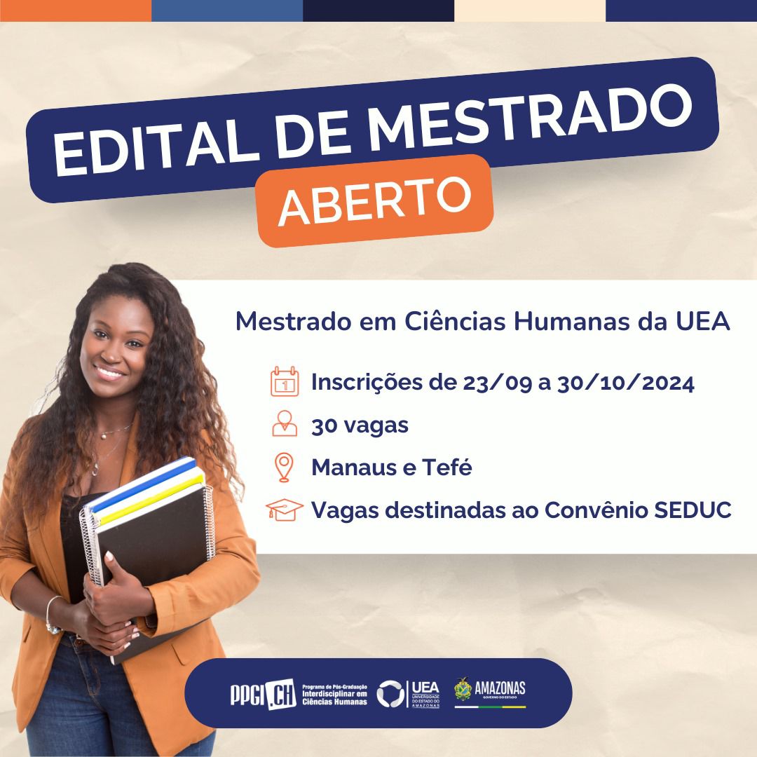 AMAZONAS – A Universidade do Estado do Amazonas (UEA) está com inscrições abertas para o mestrado em Ciências Humanas, com ingresso previsto para 2025. O curso oferece um total de 30 vagas em Manaus e Tefé (distante 523 quilômetros de Manaus), sendo 10 vagas exclusivas para professores e/ou pedagogos da Secretaria de Educação e Desporto Escolar (Seduc/AM). Para ingressar, os candidatos devem se inscrever até as 23h59 do dia 30 de outubro, no link: https://selecao2.uea.edu.br/?dest=info&selecao=10683.