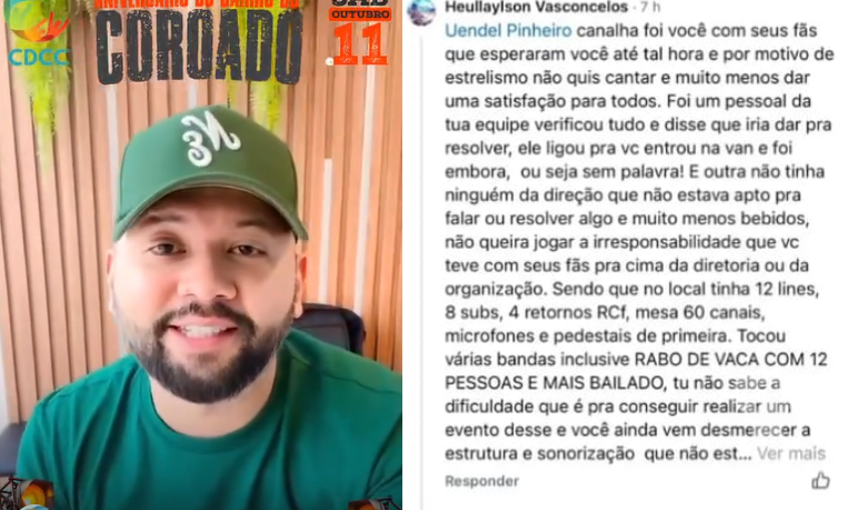 O presidente da comunidade, André Falcão, também rebateu as alegações de Pinheiro. “Depois que ele saiu de lá, entrou a Rabo de Vaca e deu um show pra comunidade. E a banda, além dos bailarinos, coube em cima do palco, do trio. E outra coisa, ele fez uma postagem mentirosa. Disse que toda a organização estava bêbada. Eu não bebo, eu estava sóbrio lá. Ele desrespeitou a comunidade, fez uma coisa muito feia. Disseram que ele era grande, mas eu vejo que a arrogância, a personalidade dele, o sucesso é do tamanho da arrogância dele (…) Se depender de mim, esse rapaz nunca mais toca em festa do bairro”.