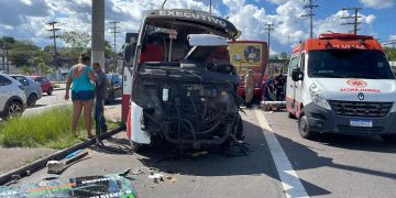 ADVERTISEMENTMANAUS (AM) – Um acidente entre um ônibus do transporte público e um micro-ônibus do transporte alternativo deixou várias pessoas feridas na tarde desta sexta-feira (2), na Torquato Tapajós. Em vídeos divulgados, é possível ver que a frente do alternativo foi totalmente arrancada. Uma mulher é vista ensanguentada no banco que fica atrás do motorista. … Continue lendo Urgente: Acidente gravíssimo entre ônibus e micro-ônibus deixa vários feridos na Torquato