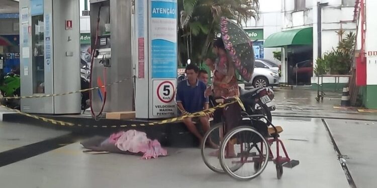 A vítima estava deitada ao lado de uma das bombas de combustíveis quando foi achada por funcionários do estabelecimento.