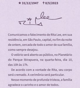 PAÍS| A cantora e compositora Rita Lee morreu nesta segunda-feira (8), aos 75 anos. Em 2021 a artista foi diagnosticada com câncer de pulmão e vinha se tratando contra a doença.