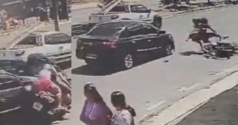 A mulher da garupa também foi parar debaixo do carro e está e situação grave. O caso ocorreu na Cosme Ferreira e foi filmado por uma câmera.