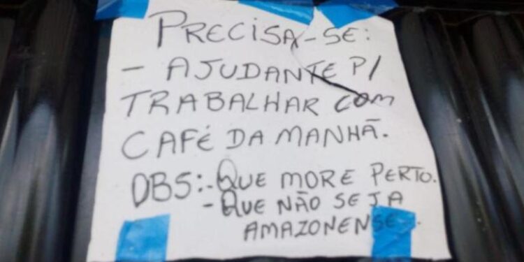 A polêmica é justamente pelo fato de terem excluído os amazonenses da vaga. “Precisa-se: – Ajudante para trabalhar com café da manhã. Observação: que more perto. Que não seja amazonense”.
