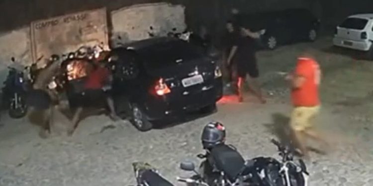 O crime foi registrado pelas câmeras do condomínio e mostram o bando de assassinos cercando o carro dirigido pelo homem. O condutor ainda tentou fugir, mas não tinha para onde correr.