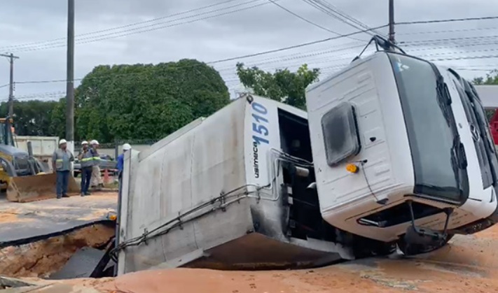 MANAUS – A Águas de Manaus atualizou a lista de bairros sem água nesta quarta-feira (11), depois que um caminhão foi “engolido” por uma cratera, devido ao rompimento da tubulação na avenida Coronel Teixeira, no bairro Ponta Negra.