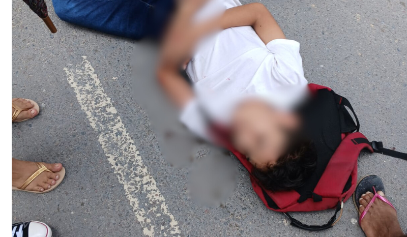O garoto ficou jogado no chão esperando socorro. Ele usava calça jeans, blusa branca, e carregava uma mochila vermelha nas costas. O Serviço de Atendimento Móvel de Urgência (Samu) foi acionado.
