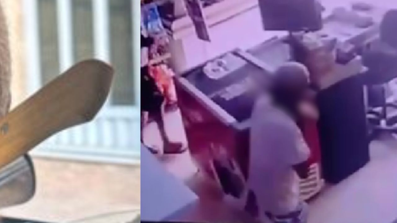 Nas imagens registradas por câmeras do estabelecimento, o idoso aparece no balcão quando o homem acerta a faca no pescoço dele pelas costas.
