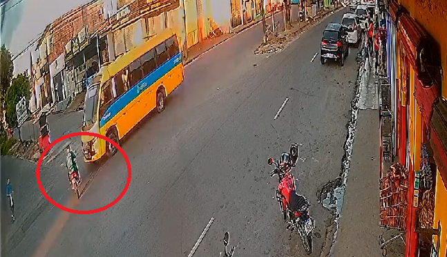MANAUS (AM) – Uma câmera de segurança registrou o momento em que o motociclista Luciano Moraes de Jesus, de 43 anos, é acertado em cheio por um transporte alternativo, o “Amarelinho”, nesta quinta-feira (9). O ônibus estava em alta velocidade na avenida Curaçao, bairro Nova Cidade, Zona Norte de Manaus.